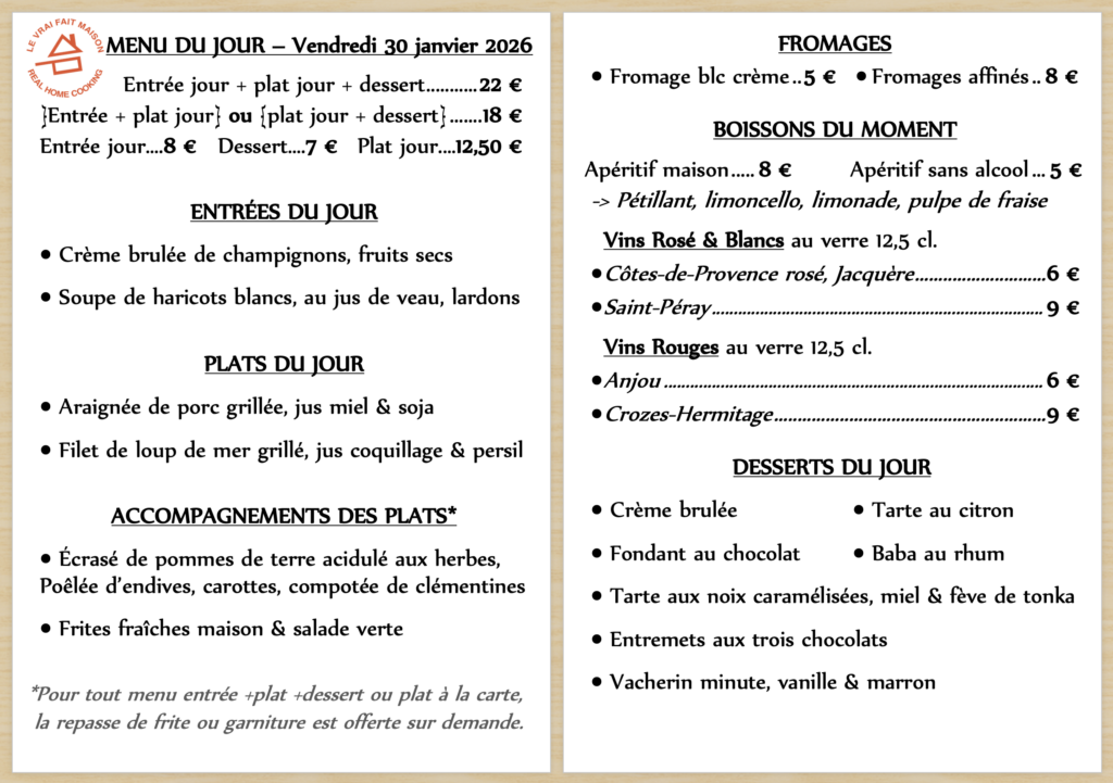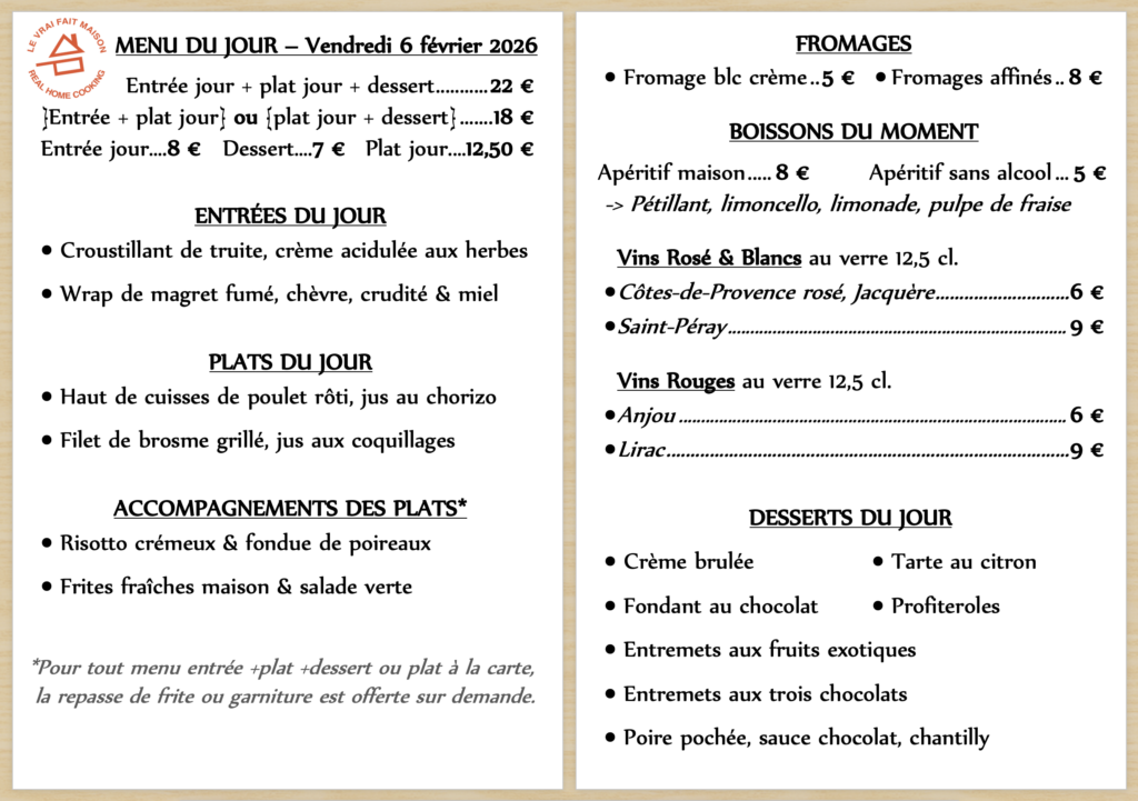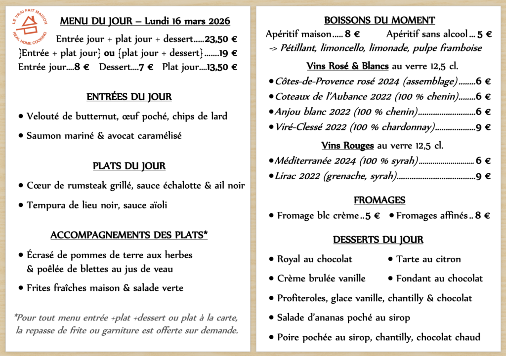 Chaque midi de semaine, le chef imagine son menu du jour à partir de 16€ et vous propose ses suggestions du moment. Le menu du jour évolue au fil des jours et des saisons Il comprend un choix de deux entrées, de deux plats (viande ou poisson) et un large choix de desserts. À l’image de la carte du week-end, le menu du jour est élaboré avec finesse, créativité et raffinement à partir de produits frais et de saison. Sublimer les produits les plus simples et donner à son menu du jour des airs de cuisine gastronomique sans prétention aucune, c’est le défi que s’est donné le chef !